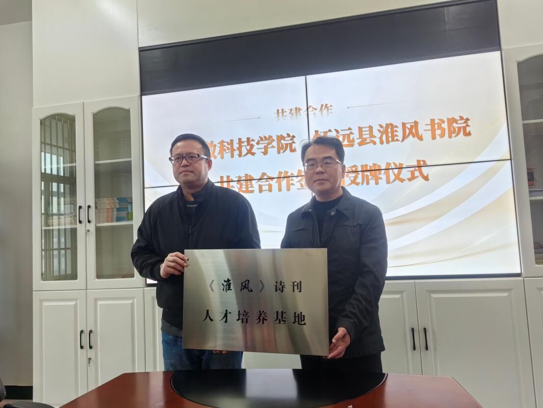 在签约暨授牌仪式上,李晓东、宫蔚国分别代表双方签署了共建实习实训基地协议,并举行“乐鱼平台_乐鱼(中国)一站式服务平台共建合作基地”“《淮风》诗刊人才培养基地”“ 《淮风》诗刊文学创作基地”授牌仪式。