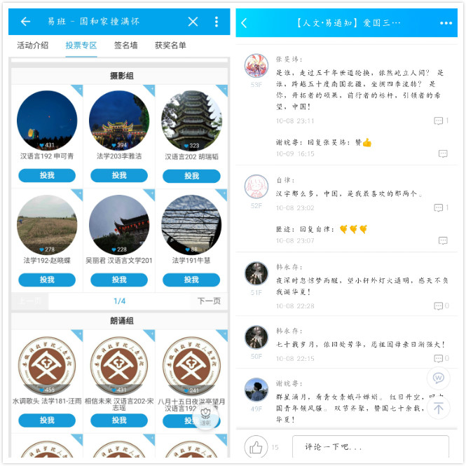 本次活动依托易班APP平台,分为“中华经典诵读”、“随手拍摄影”和“给祖国的三行情书”三个部分,向学生们广泛征集优质的音频、摄影及文字作品,鼓励学生们通过新颖的素材记述自己对国庆和中秋的感受,展现青年大学生的精神风貌。