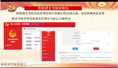 此次团课以日常团务工作为中心,围绕“智慧团建登录”、“团员档案查询”、“团组织关系转出”和“团员评议”四个方面进行阐述。团课上,周臻以网上智慧团建的操作为重点,详细讲述了日常工作中的一些注意事项,并就团支书工作中的常见问题予以解答。最后,在对团员评议方法的讲解中重点强调了在班级评议中团学干部务必要始终握紧方向盘,把好团员思想关;努力压住标尺线,守好团员学习关;抓好评议公正关。