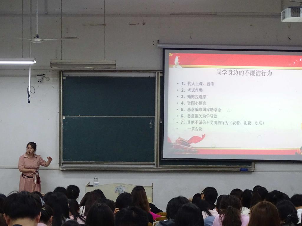 清正在德,廉洁在志。李沙娜以“何为廉”“何由廉”“何以廉”三个问题贯穿始终,通过历史人物廉洁故事为切入点引入同学日常生活存在的廉洁问题,提醒并教育同学在面对人生道路的各种压力和诱惑时,要牢守初心,树立并坚守正确的世界观、人生观、价值观。最后,李沙娜要求各同学要以“祸患常积于忽微”之心对待小事、小节、小利,时刻自重、自省、自警、自励,慎独慎微慎终如始。坚守自律与他律,勤学笃行,踏实肯干,主动担当。