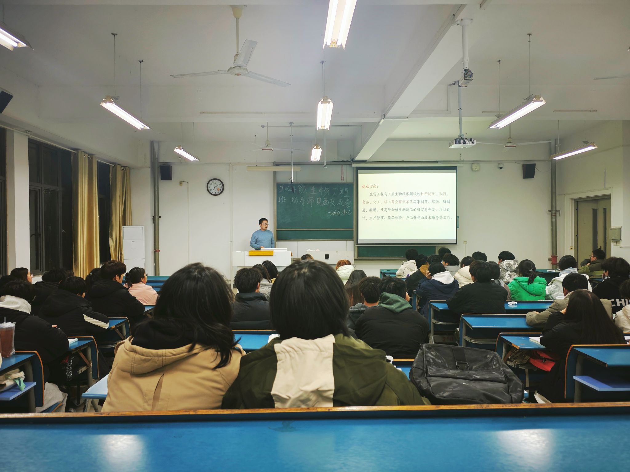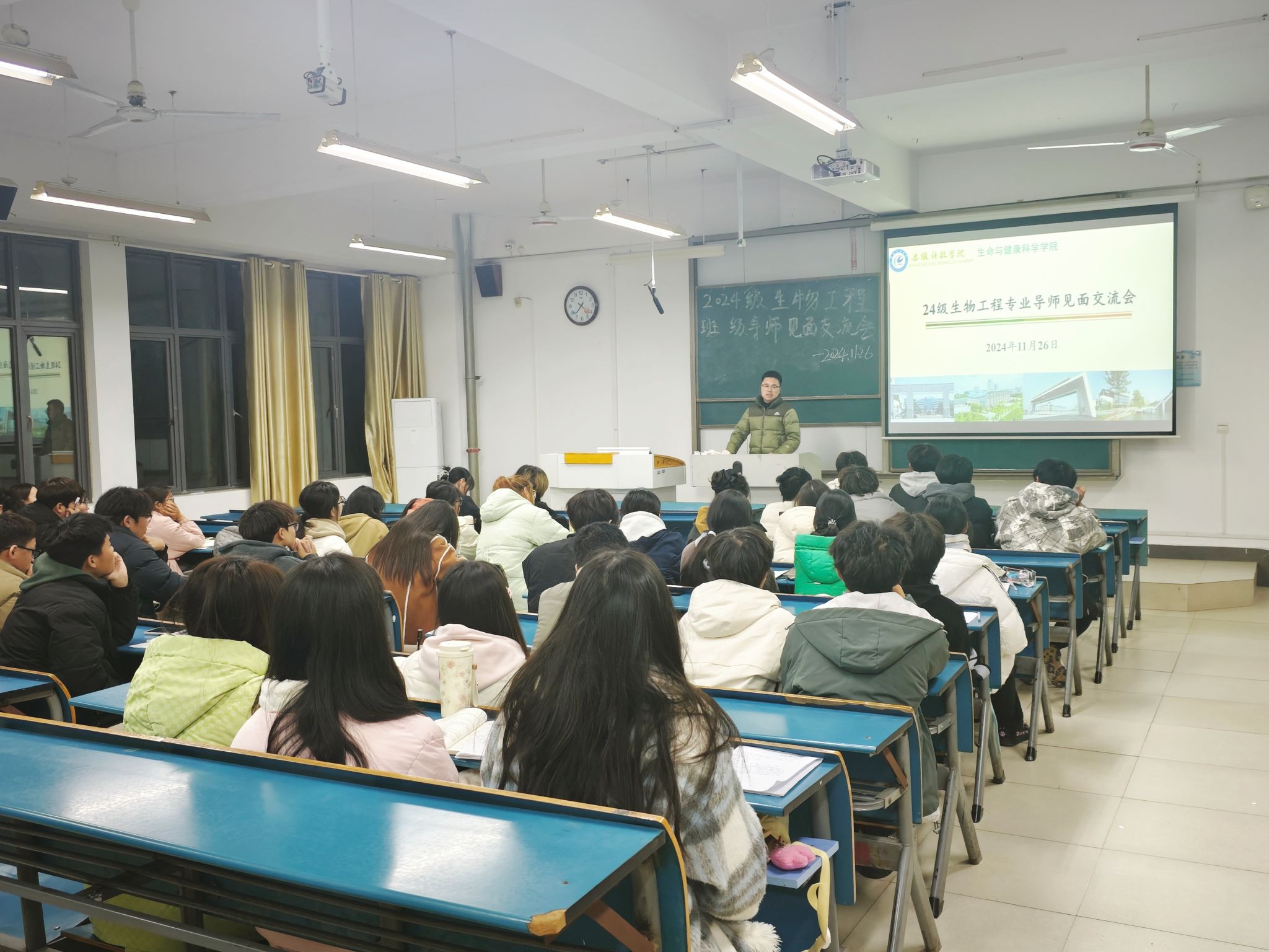 11月26日晚上,生物医学与健康学院于求知楼B207教室举办2024级生物工程专业导师见面交流会。学院2024级生物工程专业导师孟奇、杨龙和2024级生物工程专业70名新生参加了班级导师见面会。会议由24级生物工程专业辅导员邓艳萍主持。
