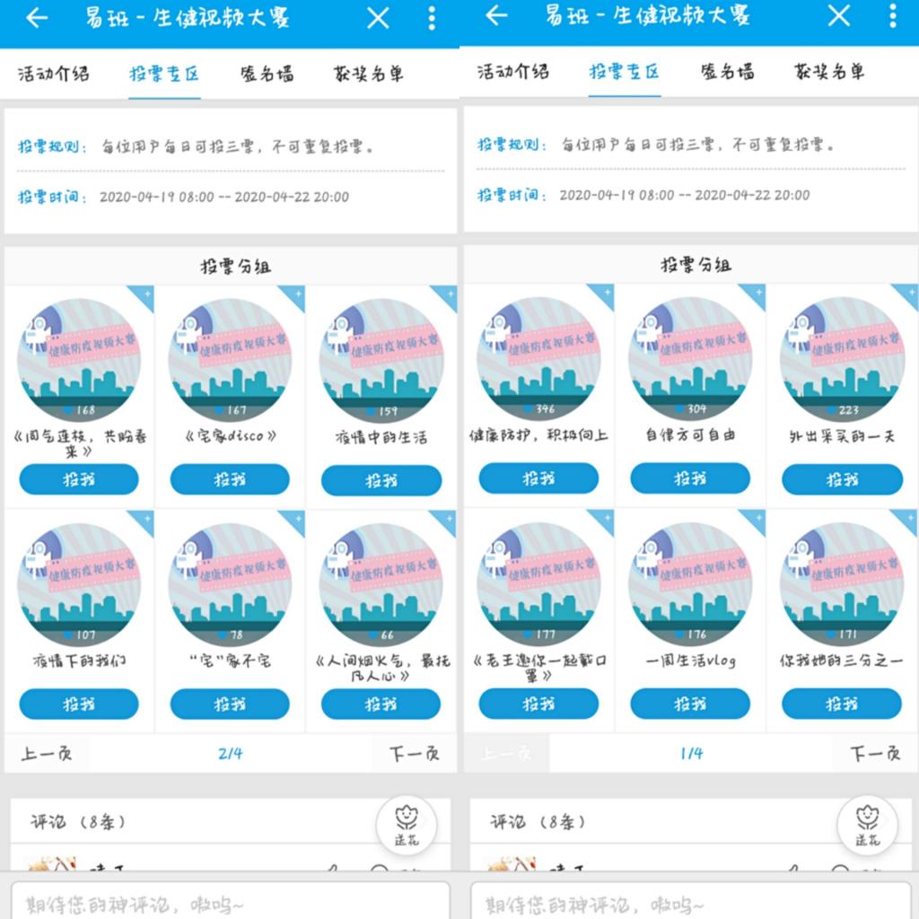 比赛在易班公共平台上开启投票渠道,众多欢乐有趣的视频引起很多同学的关注,同学们纷纷为自己喜爱的作品进行投票。经过易班投票和评委打分,最终,来自中药学192班朱雨辰的作品《健康防护,积极向上》荣获一等奖。来自生物工程192班的龙琳娜的作品《自律方可自由》以及周文芳的作品《外出采买的一天》分别获得二等奖,其他同学分获三等奖及优秀奖。