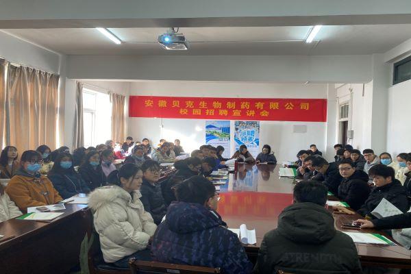 招聘会上,安徽贝克生物制药有限公司行政部苏其成详细介绍了公司概况、组织结构、企业文化、企业荣誉、主营产品、人才培养、招聘岗位和福利待遇等内容。该公司副总经理蔡薇与同学们现场进行了互动交流,并就同学们关心的问题逐一进行回答。部分同学与公司初步达成就业实习意向。