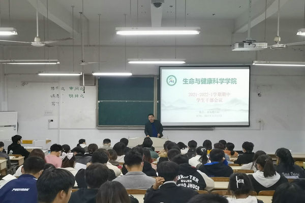 11月17日下午,生命与健康科学学院在求知楼A101教室召开本学期期中学生干部会议。学院党委副书记彭丽萍,党政办公室主任王传林,正科级辅导员兼组织员邓艳萍,团委副书记姜毅,副科级辅导员刘国祥以及专职辅导员孙玉楼、张迪出席本次会议,各班级团支部书记、班长,学习委员及院学生会主要干部参加本次会议。会议由姜毅主持。