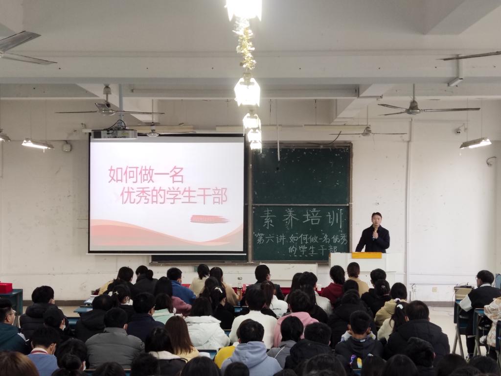 詹学文以《如何做一名优秀的学生干部》为主题,从“什么是学生干部”、“优秀学生干部应具备哪些素养”、“如何做一名优秀的学生干部”三个部分展开讲解。詹学文首先向同学们详细解释了“学生干部应该首先是学生其次是干部”的含义,使同学们对于学生干部有了更深刻的理解。接着,詹学文强调了学生干部应具有的素质,要求同学们不忘初心,牢记“四个意识”;坚守本心,杜绝官僚主义;强化信心,提升综合素质;以身作则,常怀敬畏之心。最后,詹学文就“如何做一名优秀的学生干部”向同学们提出了具体要求,希望同学们在今后的工作中更加积极主动,不断的提高自身的工作能力,秉着“一起从实际出发”的理念,强化自我修炼、自我约束、自我改造,立志做党光荣传统和优良作风的忠实传人。