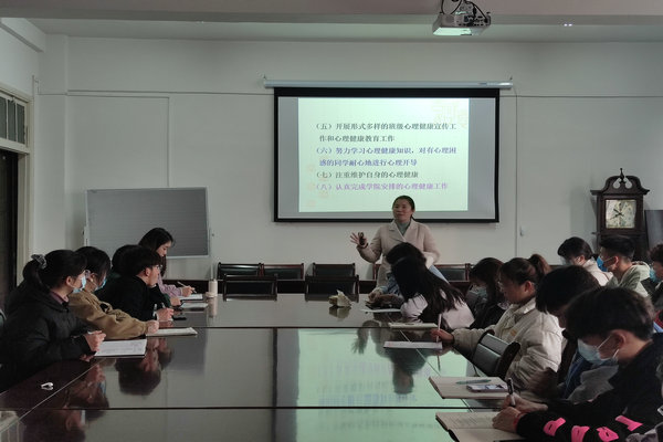 彭丽萍从社会竞争激烈、学习和生活压力大、身心发展不够成熟三个方面向同学们讲述了开展大学生心理健康教育工作的意义。围绕心理委员应具备的能力和素质,心理委员的工作职责,大学生常见的心理困惑,产生大学生心理困惑原因分析,心理委员如何有效开展“朋辈”心理健康辅导工作展开讲解。为引导同学们重视心理健康教育工作,她着重强调心理委员的重要性并对心理委员提出了以下五点要求:一是加强学习,学习心理健康知识,不断提升心理素质和工作能力;二是学会倾听,要善于引导学生自我教育、自我管理;三是学会共情,换位思考;四是不把自己的价值观念强加与别人,发挥“朋辈”辅导功能;五是要与时俱进,不断创新工作方法。同时,她希望同学们要做一个身心协调发展,内心强大,积极进取,韧性十足的人。最后,彭丽萍介绍了乐鱼平台_乐鱼(中国)一站式服务平台心理健康工作四级网络结构,再一次强调了乐鱼平台_乐鱼(中国)一站式服务平台对大学生心理健康教育工作的重视。