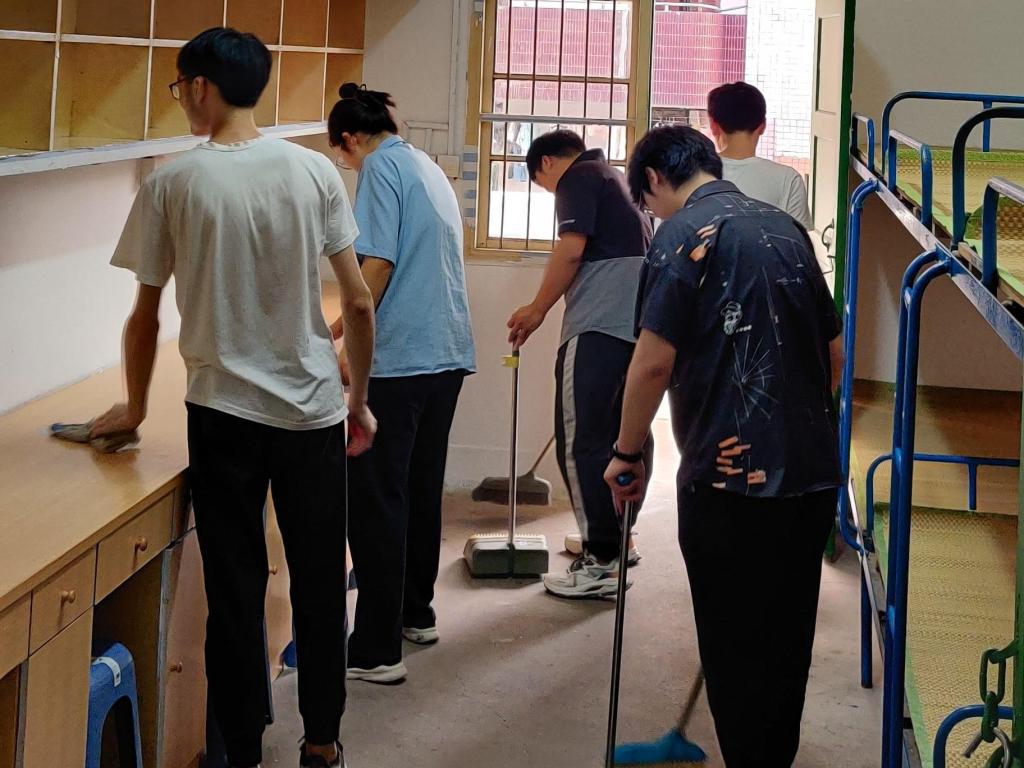 清扫过程中,同学们分工明确,以小组为单位配合开展新生宿舍的清洁工作。同学们自带扫帚、垃圾袋、拖把、毛巾等工具,积极主动地打扫宿舍的每一处角落,同时认真排查宿舍存在的安全隐患,以及设施是否完好等问题,及时汇总上报,为新生进校做足准备。在同学们的共同努力下新生宿舍焕然一新,圆满完成宿舍清扫工作。