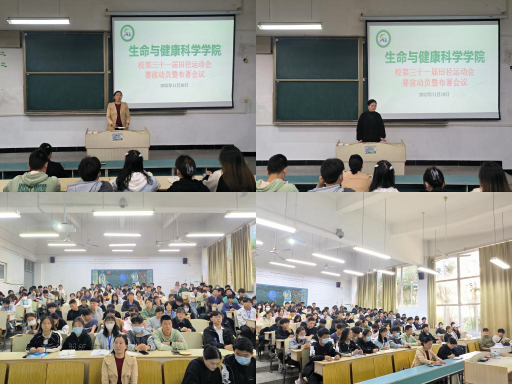 为活跃校园文化,弘扬体育精神,确保参赛工作有序开展,11月10日中午,生命与健康科学学院于求知楼A101教室召开校第三十一届田径运动会赛前动员暨布署会议。学院党委副书记、纪委书记彭丽萍,团委副书记姜毅出席会议,全体参赛运动员及学院各学生组织成员参加此次会议。会议由学院艺体中心主任张雪雪主持。