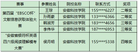 此外,在安徽省高等学校数字图书馆举办的“第四届‘EBSCO杯’文献信息获取体验大赛”中、 “安徽省银符杯英语四六级阅读理解模考大赛”中,乐鱼平台_乐鱼(中国)一站式服务平台学子也取得了良好的成绩。获奖名单如下: