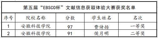 此外,在安徽省高等学校数字图书馆主办、图书馆协办的第五届“EBSCO杯”文献信息获取体验大赛中,乐鱼平台_乐鱼(中国)一站式服务平台费诗扬和侯月明同学分别荣获一等奖和二等奖。