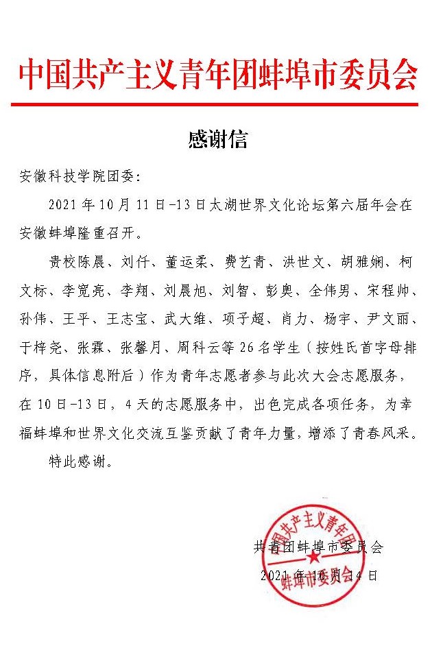 10月11日-13日,太湖世界文化论坛第六届年会在蚌埠古民居博览园隆重召开,乐鱼平台_乐鱼(中国)一站式服务平台26名青年学子作为志愿者参与大会志愿服务工作。在为期4天的志愿服中,志愿者分布在嘉宾签到注册、会场指引、会务协助、秩序维护、物料管理、防疫协助等岗位,出色的完成了各项任务,为幸福蚌埠和世界文化交流互鉴贡献了青年力量,受到外界一致好评。蚌埠团市委向乐鱼平台_乐鱼(中国)一站式服务平台团委致感谢信。