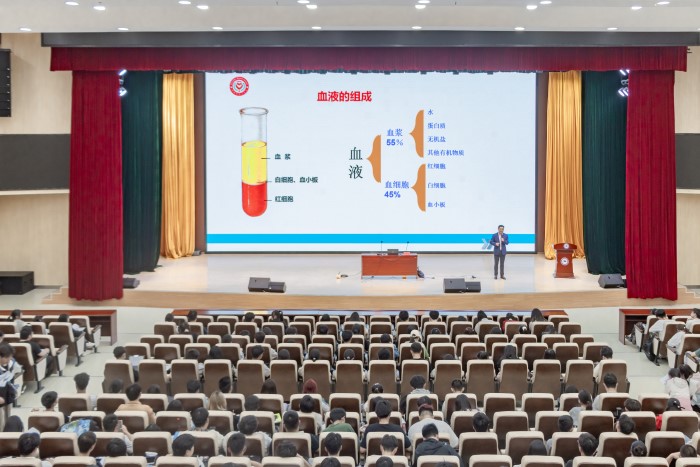余加宏从无偿献血政策的实施原因、血液的组成与血型、世界各国及地区的无偿献血情况、献血对人体的影响、无偿献血存在的问题、献血前中后的注意事项等九个方面介绍了关于无偿献血的知识。他指出,献血法的颁布是社会主义精神文明建设的需要,无偿献血政策实施以后,当前国家血库的血容量较1998年以前翻了两番,但需求量仍较大,还存在着紧缺的状况。余加宏以自己亲身献血经历号召大家积极参与无偿献血,以满足临床献血供应,保障公民身体健康,并就无偿献血过程中的相关问题与青年学生进行了互动。