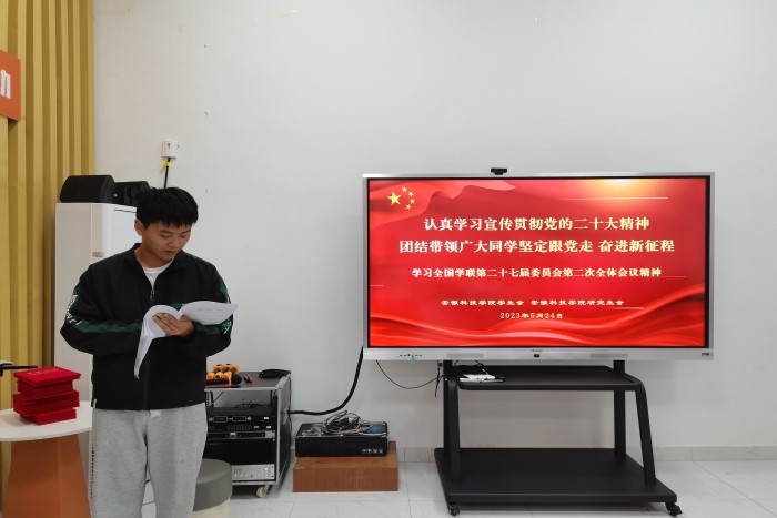 5月24日,校学生会和研究生会在凤阳校区团委多功能厅和龙湖校区致知楼C209联合学习全国学联第二十七届委员会第二次全体会议精神,校学生会和研究生会全体成员参加会议,校学生会主席团成员窦强强、研究生会韩晶璠和方习胜主持会议。