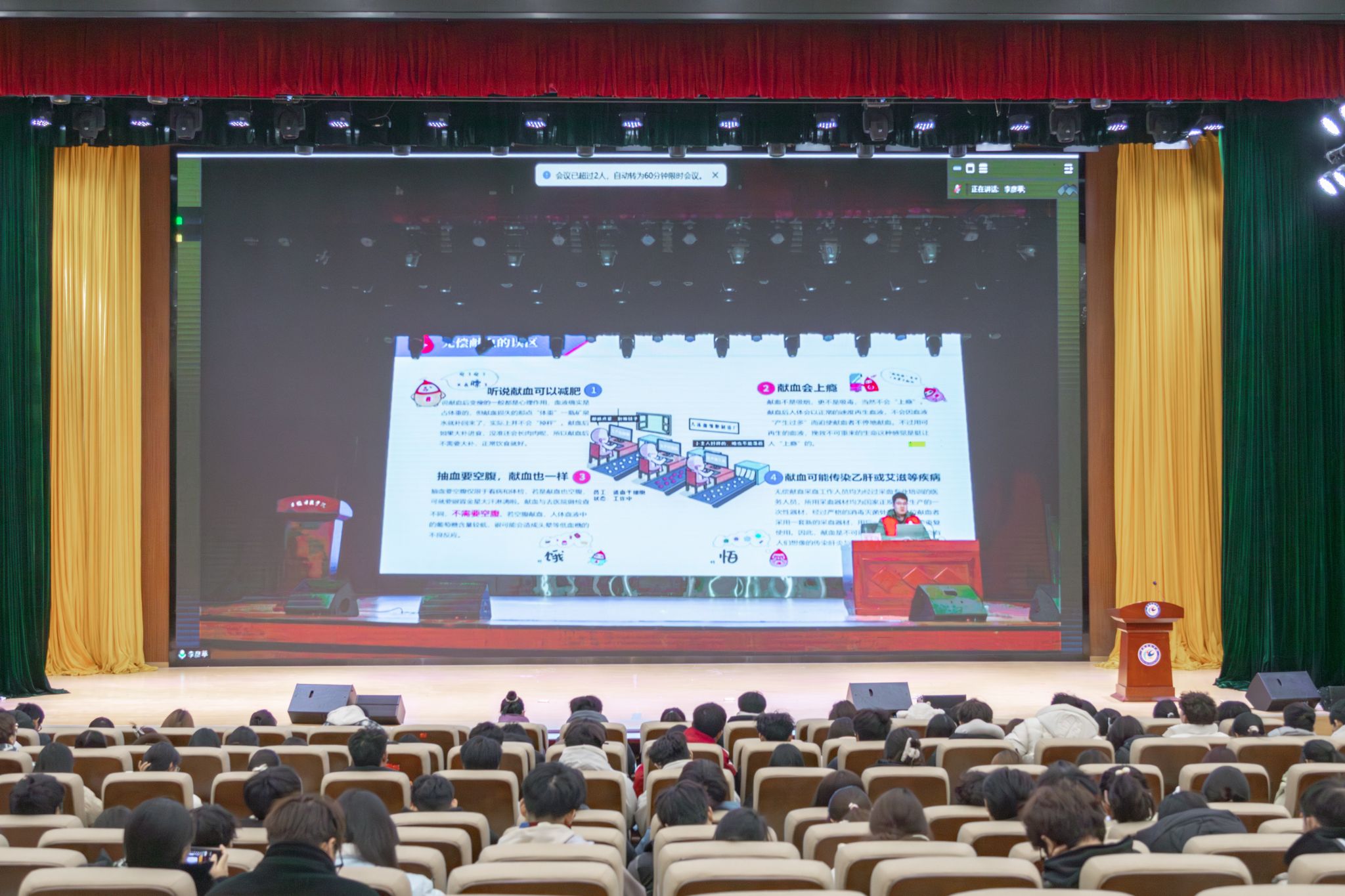 余加宏通过抢答互动的形式,根据任启阳的宣讲,与同学们深入互动,并从医学专业视角,深入解读了献血者健康筛查标准、献血年龄和不同血型献血的差异、献全血间隔时间、献血过程中可能出现的生理反应及应对策略等一系列关键要点。他表示,无偿献血既能帮助他人又能促进自身健康的社会公益活动,鼓励同学们以科学的态度认识献血并积极参与。