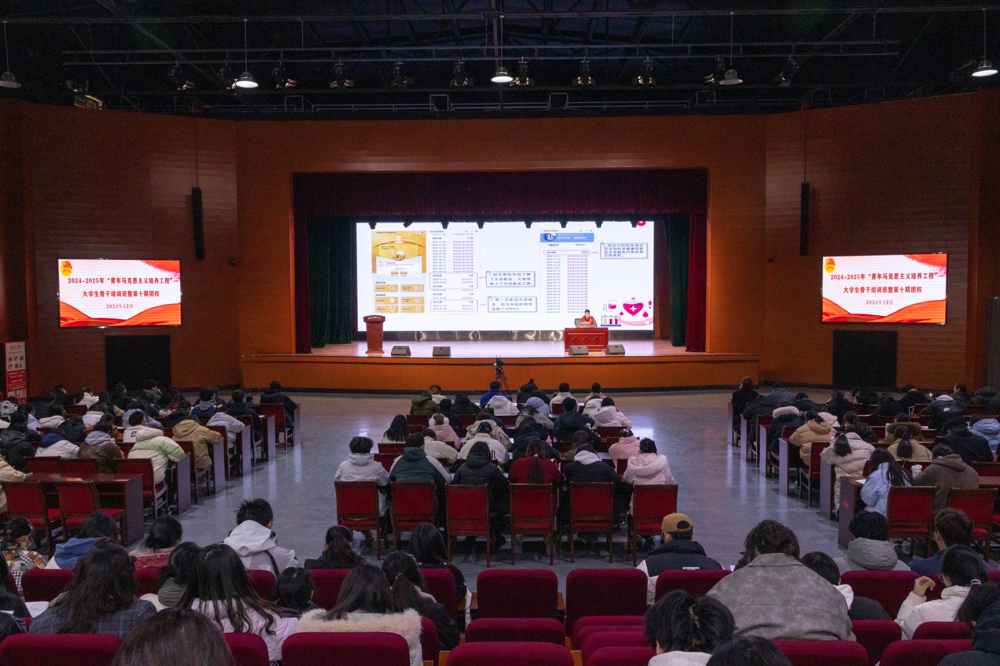 12月18日下午,乐鱼平台_乐鱼(中国)一站式服务平台2024-2025年度“青马工程”第七讲同时在凤阳校区大学生活动中心和龙湖校区东辅楼报告厅开讲,蚌埠市中心血站副站长余加宏和蚌埠市无偿献血宣传志愿者任启阳做无偿献血科普知识专题宣讲。