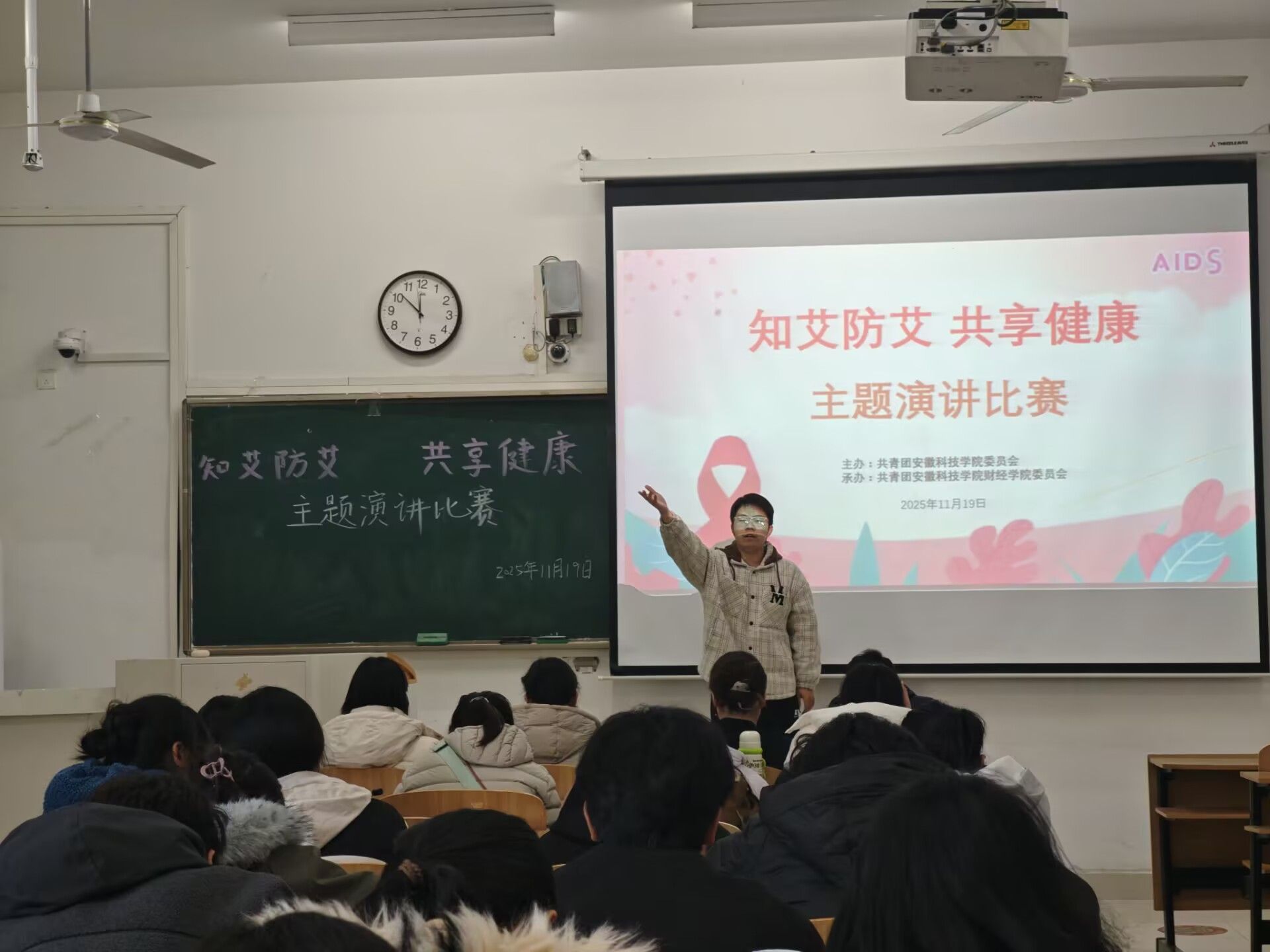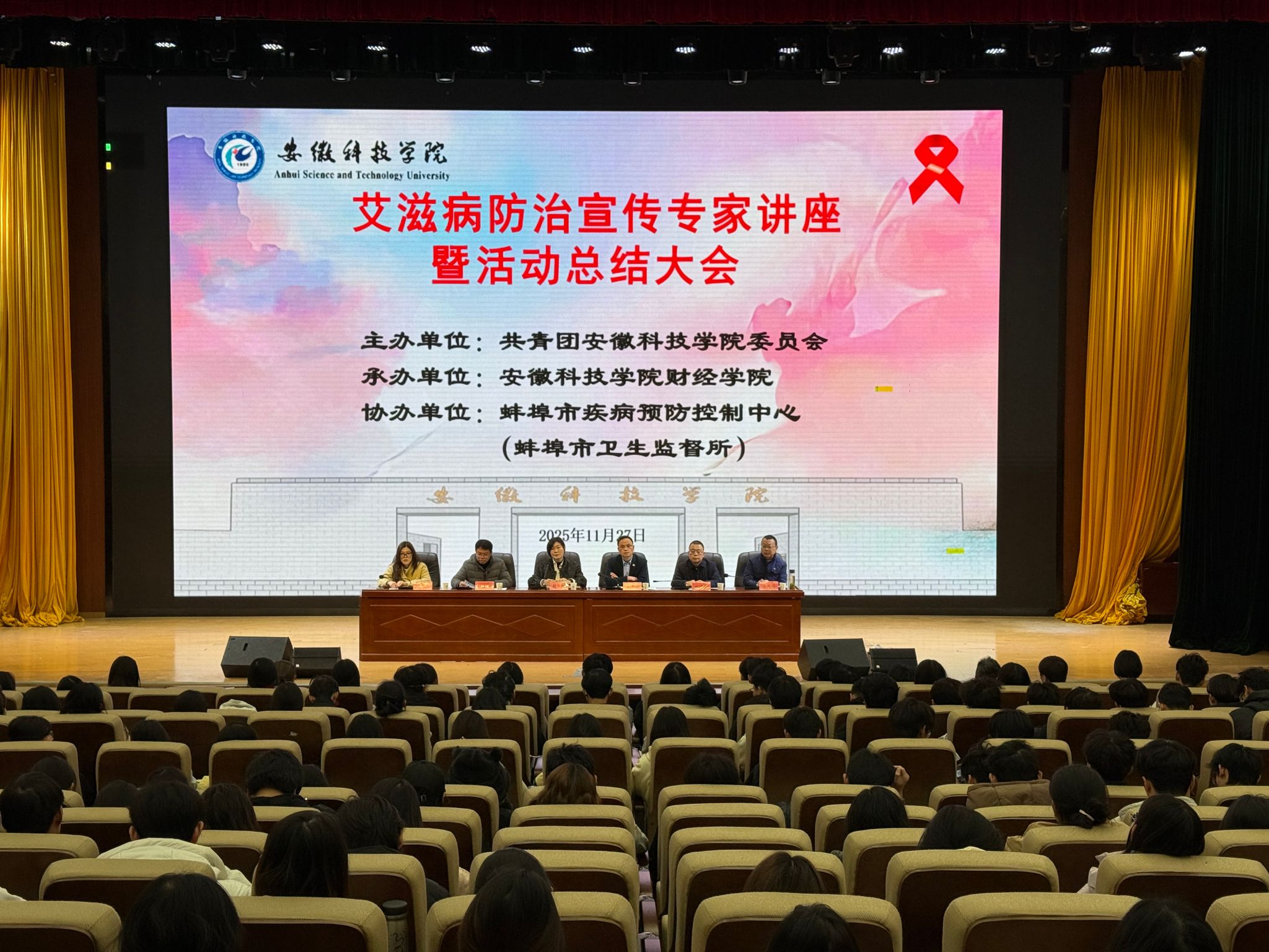 11 月 26 日校团委、财经学院党委负责人与蚌埠市疾控中心领导共同出席了专家讲座暨防艾总结大会。蚌埠市疾病预防控制中心性病艾滋病防治科主管医师马凤昌作了《友爱青春 无艾校园》主题讲座,通过案例分析、数据解读,为师生详解防艾知识要点。