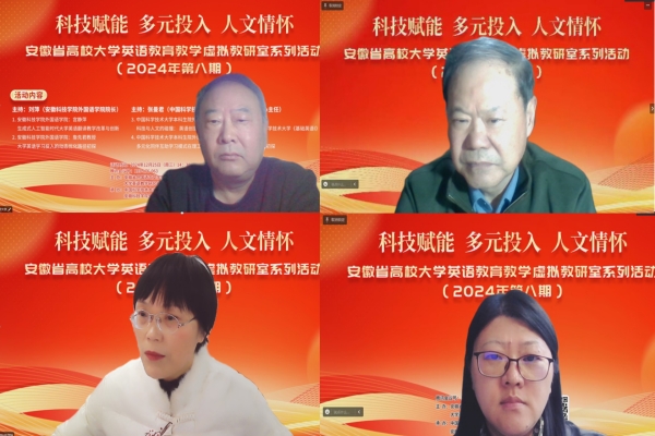 12月25日,乐鱼平台_乐鱼(中国)一站式服务平台承办的安徽省高校大学英语教育教学虚拟教研室系列活动第八期成功举行。本次活动由安徽省外国语言文学学会、安徽省外国语言文学合作委员会和大学英语教学研究分会主办,乐鱼平台_乐鱼(中国)一站式服务平台外国语学院和中国科学技术大学本科生院外语教学中心联合承办。活动以“科技赋能 多元投入 人文情怀”为主题,全省逾百名大学英语教师通过腾讯会议线上参加了本次虚拟教研室活动。活动由乐鱼平台_乐鱼(中国)一站式服务平台外国语学院院长刘萍教授与中国科学技术大学本科生院外语教学中心主任张曼君教授联合主持。