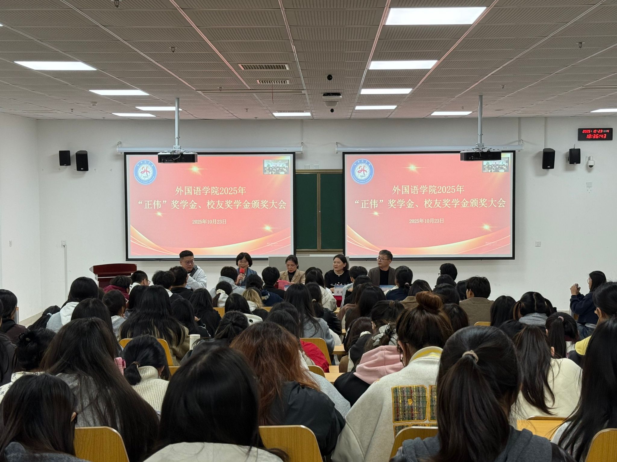 为表彰优秀学子、树立学习榜样,10月23日晚,外国语学院在滁州校区学术报告厅举办校友奖学金颁奖大会。奖学金捐赠校友、学院党政领导、全体辅导员、获奖学生代表、部分在校生参加大会。会议由学院党委书记蔡为青主持。