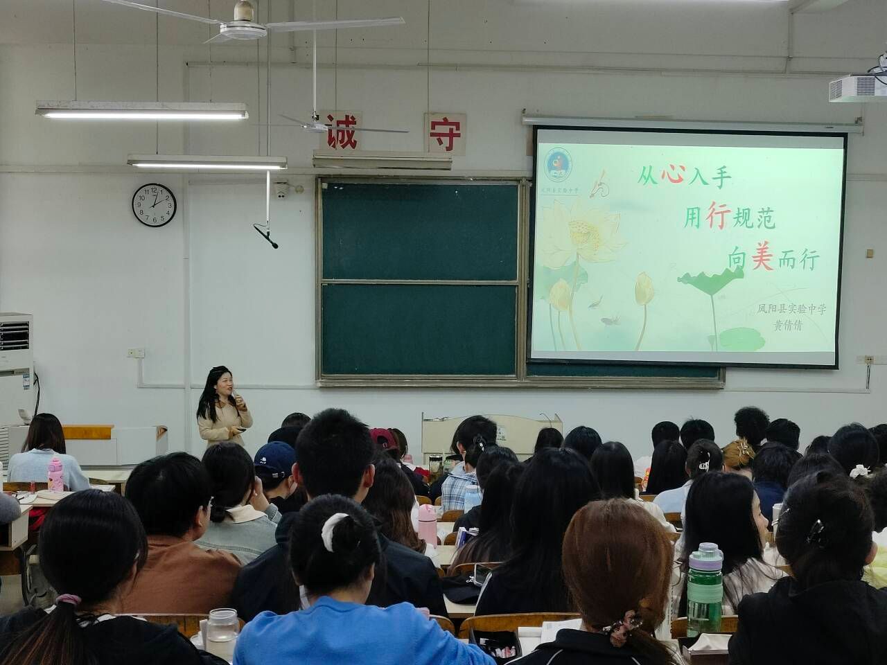4月15日下午,凤阳县实验中学优秀英语教师黄倩倩应邀来乐鱼平台_乐鱼(中国)一站式服务平台作师范专业班级管理专题讲座,2022级全体英语(师范)专业学生参加,讲座由外国语学院副院长洪民主持。