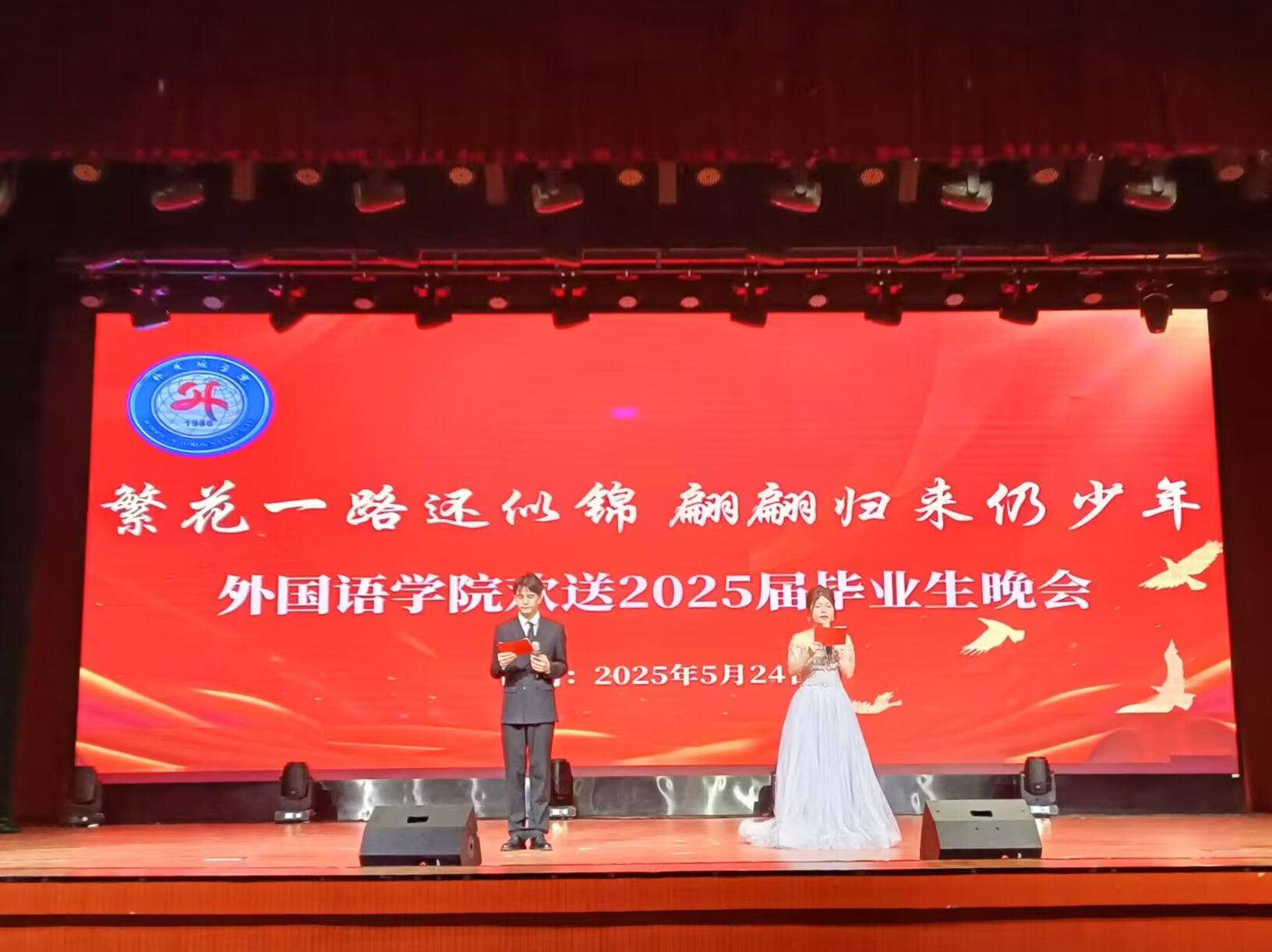 5月24日晚,外国语学院“繁花一路还似锦,偏偏归来仍少年”欢送2025届毕业生晚会在校大学生活动中心举行。学院党政领导、教师代表及全体学生共同见证了这一温情时刻。