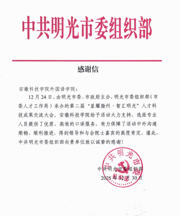 近日,外国语学院收到明光市委组织部发来的感谢信,对学院在第二届“星耀滁州·智汇明光”人才科技成果交流大会中提供的优质、高效的口译服务表示高度肯定与诚挚感谢。