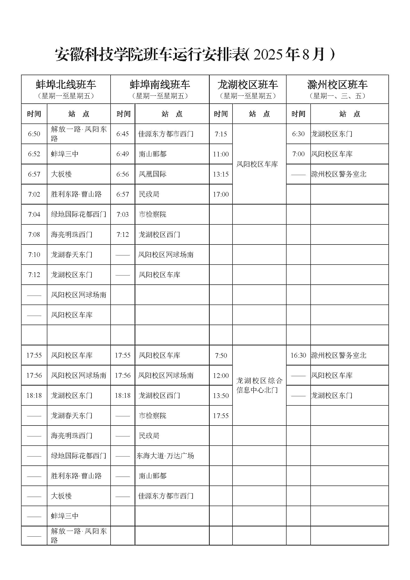 (一)蚌埠南、北线班车各站点按《乐鱼平台_乐鱼(中国)一站式服务平台班车运行安排表(2025年8月)》早上推迟15分钟发车,晚上提前10分钟发车;