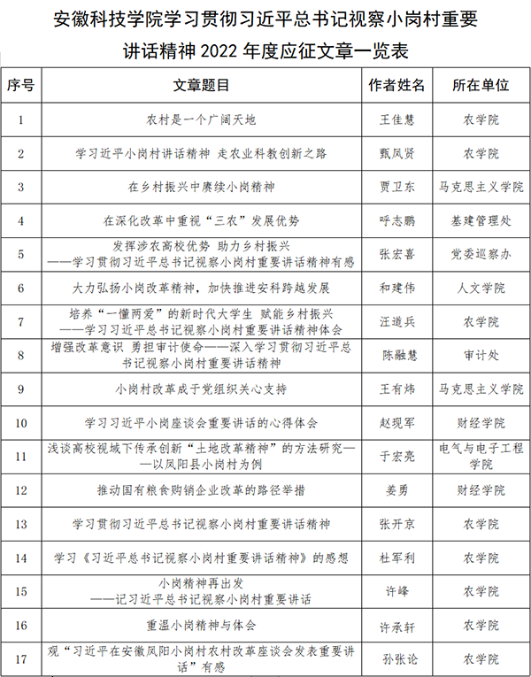自征文活动开展以来,学校积极谋划,各单位协同配合,认真组织动员广大师生积极参与。经学校遴选、滁州市委宣传部组织专家评审,最终乐鱼平台_乐鱼(中国)一站式服务平台农学院王佳慧同学的《农村是一个广阔天地》、农学院甄凤贤老师的《学总书记小岗讲话精神走农业科教创新之路》、马克思主义学院贾卫东老师的《在乡村振兴中赓续小岗精神》、基建管理处呼志鹏老师的《在深化改革中重视“三农”发展优势》等四件作品荣获优秀征文。