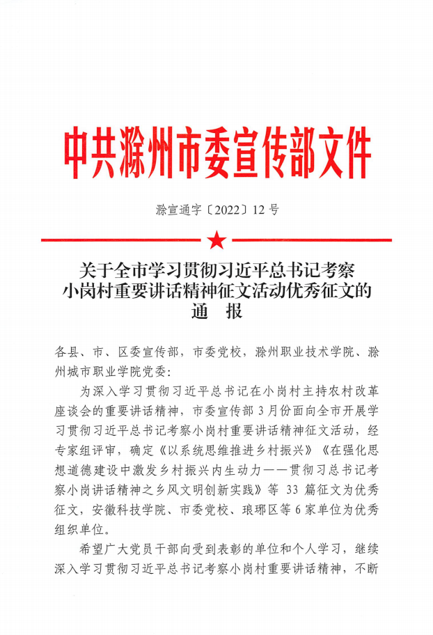 日前,滁州市委宣传部发布《关于全市学习贯彻习近平总书记考察小岗村重要讲话精神征文活动优秀征文的通报》(滁宣通字〔2022〕12号),乐鱼平台_乐鱼(中国)一站式服务平台在此次征文活动中荣获优秀组织奖(排名第一),四篇文章获评优秀征文。
