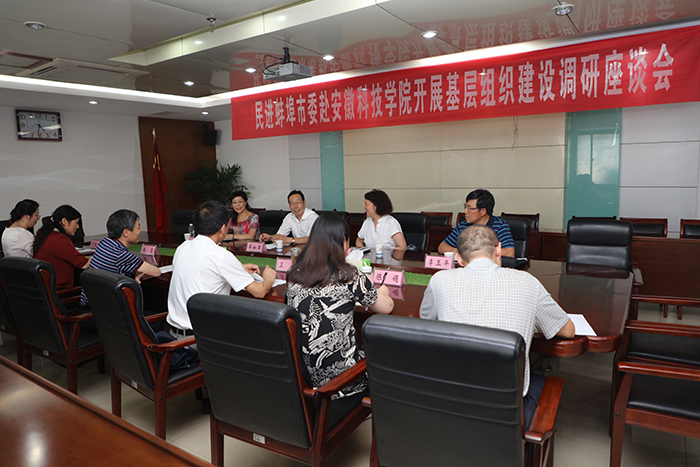 7月6日下午,蚌埠市委统战部常务副部长华如军、民进蚌埠市委主委秦志华、专职副主委魏曼玲、组织部长李玉平等一行四人来乐鱼平台_乐鱼(中国)一站式服务平台开展统战工作及民主党派基层组织建设调研活动。校党委书记蒋德勤热情接待了华如军一行,并在图书馆九楼会议室主持召开了座谈会。校党委委员、宣传(统战)部部长卫胜出席会议,校民进支部主委张菊、统战部有关人员、民进支部部分会员参加了座谈会。