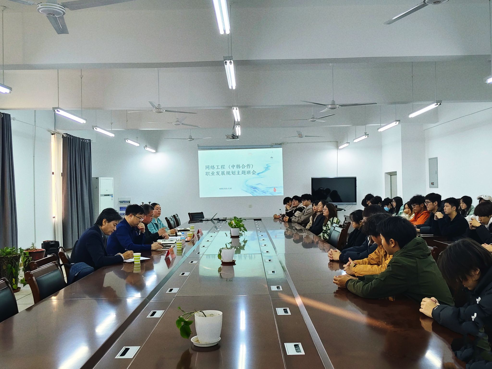 11月30日下午,信息与网络工程学院2024级网络工程(中韩合作)专业开展了“职业生涯规划”主题班会。班会特邀网络工程(中韩合作)241班联系领导教务处舒英杰(主持工作)与同学们面对面交流,倾听学子心声,指引成长方向。国际合作与交流处处长何世潮、信息与网络工程学院党委副书记韦乃学应邀出席。