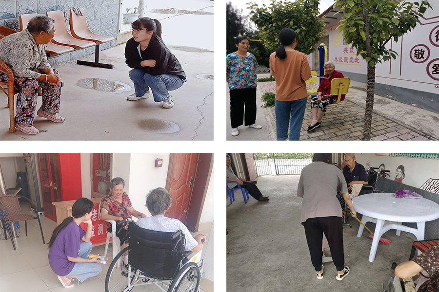 活动中,团队成员来到当地敬老院,向敬老院负责人就敬老院老人的数量、老人的生活环境、护理人员资质等方面了解了敬老院的基本情况。据敬老院负责人介绍:近年来,越来越多的老人选择敬老院安度晚年,护理人员的服务质量决定着老人的生活品质,因此国家会进行统一的服务人员事业编制考试,考察护理人员的能力,以便更好地服务老人。在敬老院中,团队成员和敬老院工作人员一起为老人们服务。团队成员有的到各楼层的房间陪老人拉家常、给老人讲笑话及养生小知识,为老人们带去欢笑和快乐;有的帮助老人整理内务,打扫卫生,捶背,让老人变得轻松愉悦;有的则在户外听老人们讲故事,让老人不再感受到孤单;有的同学对老人们进行了采访,细心的询问老人的生活近况。很多老人反映,他们在这儿的生活像家一样,敬老院工作人员的照顾十分贴心,自己的安全在敬老院中也得到了保障。