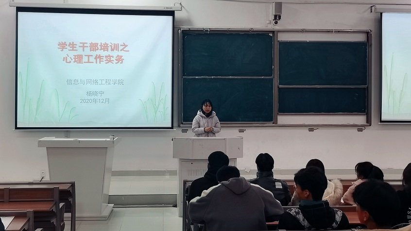 为进一步提高同学们心理素质,促进同学们身心健康发展。12月2日下午,信息与网络工程学院于致知楼C111举办学生干部培训班之班级心理工作实务培训。学院2020级各班全体班干部,分团委、学生会和易班新入职成员参加了本次培训,培训会由学员党总支秘书兼分团委书记杨晓宁主讲。