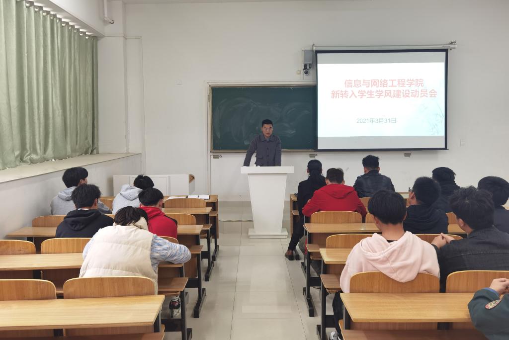 为进一步促进学院学风建设,全面了解新转入学生学习生活适应情况,3月31日下午,信息与网络工程学院在致知楼C105召开学院新转入学生学风建设动员会,学院党委副书记韦乃学、专职辅导员李军成、崔北坤及25名新转入同学参加了本次会议,会议由韦乃学主持。
