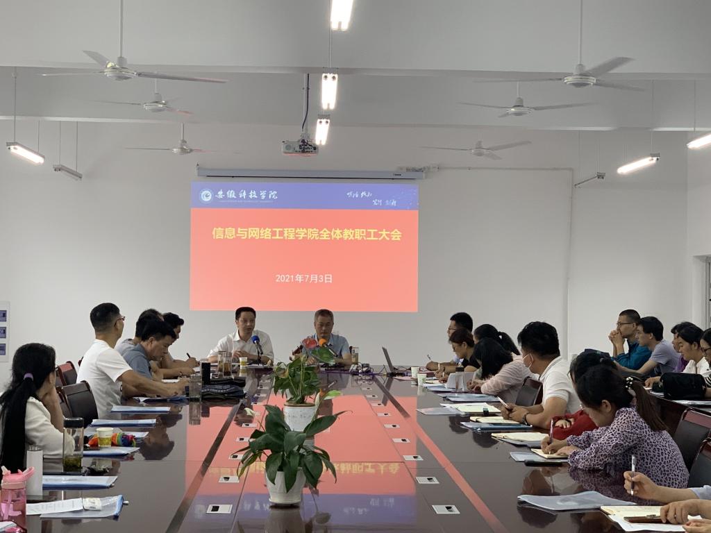 7月3日上午,信息与网络工程学院在尚行楼B418会议室召开教职工大会部署期末和暑期重点工作。学院党委书记王振其,正处级组织员周向群,党委副书记韦乃学,副院长何恩节,副院长曹浩及全体教职工参加会议,会议由学院院长余宏杰主持。