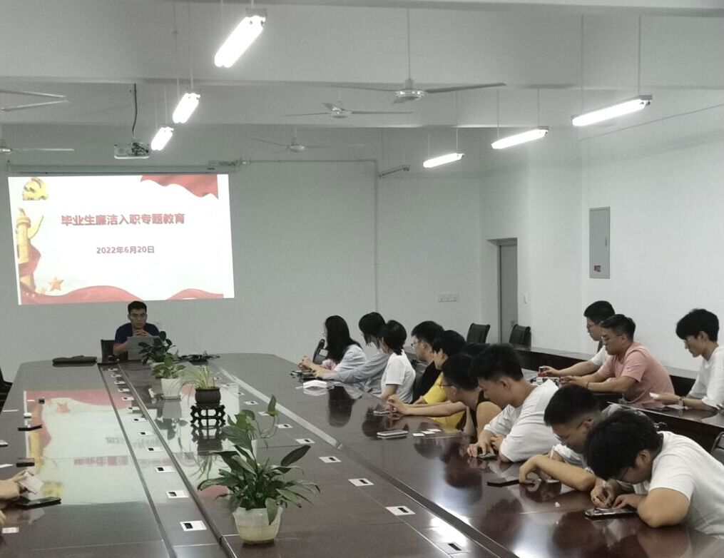 为进一步提高2022届毕业生的廉洁素养和道德自律意识,形成廉洁自律的思想品质,6月20日晚,信息与网络工程学院在尚行楼B418会议室开展毕业生廉洁入职教育活动。活动由学院就业联系人李军成主持,2022届在校毕业生参加了本次活动。