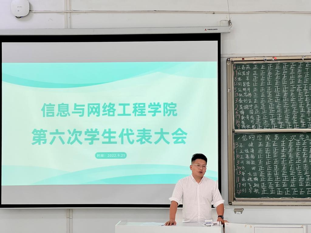 9月21日下午,信息与网络工程学院在致知楼C111召开学院第六次学生代表大会。学院学生会指导老师崔北坤出席会议,学院全体学生代表参加会议,本次会议由网络工程211班王艺陶主持。
