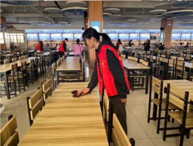 同学们在课后根据各自班级工作区域划分,前往天鹅湖、金味祥源、红鹰等餐厅展开帮厨活动,同学们忙碌的身影穿梭在食堂桌台前、餐盘回收处以及走道等各个角落,用抹布认真着擦拭每一个桌椅。最后,在同学们的共同努力下,不仅师生们提供了一个良好地用餐环境,也让同学们意识到以行动助力餐厅建设,以劳动践行个人价值。