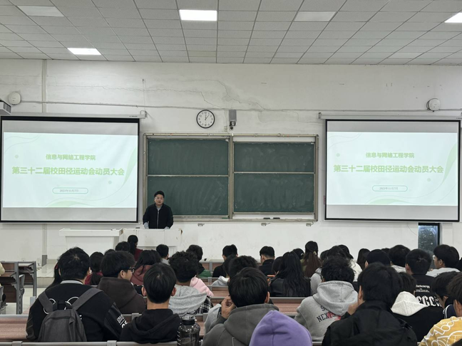 为了保障运动会志愿服务有序进行,鼓舞我院运动员的士气。11月7日中午,信息与网络工程学院在致知楼C111召开校第三十二届运动会赛前动员大会。学院党委副书记韦乃学、学生会指导老师崔北坤出席本次会议,全体运动员、学生会成员、各班班长以及体育委员参加了本次会议,会议由崔北坤主持。