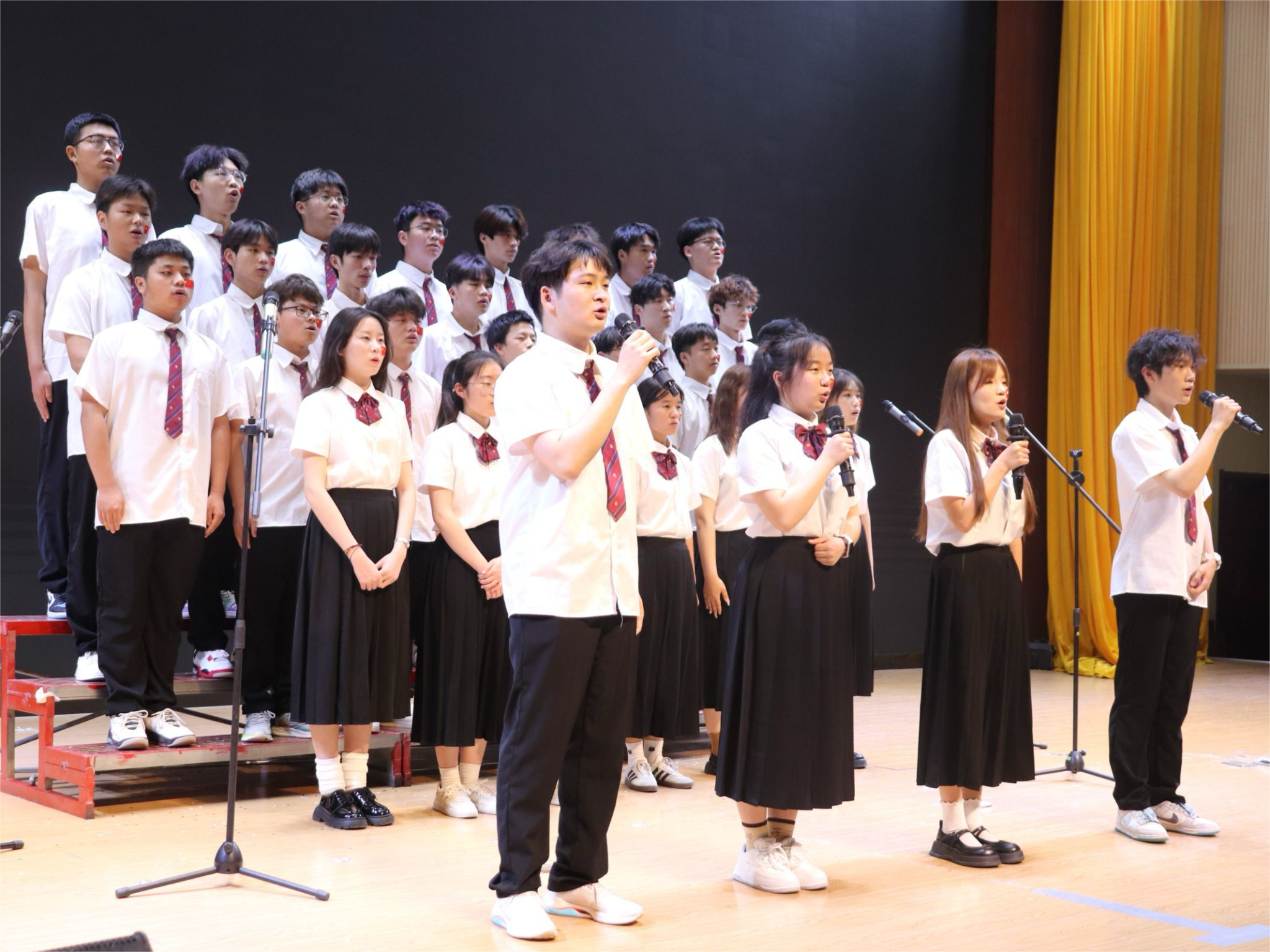 在经过前期一段时间的排练及准备,2023级共有11个班级参加本次比赛。每个班级都统一服装,同学们个个青春昂扬、精神饱满、歌喉嘹亮,表达了浓浓的爱国爱党之情,放声歌唱心中的美好憧憬。一首《有我》以激昂的旋律歌颂了青春万丈光芒,表达了青年学子坚定的理想信念;一首《微笑着胜利》歌声飘扬,引起现场观众的强烈共鸣,微笑着面对一切艰难困苦,终会迎来胜利;《披风》、《我们都是追梦人》、《平凡天使》唱出了新时代青年勇敢追梦,不甘平凡的精神面貌;《半生风雪学生版》、《少年中国说》述说了青年学子对未来的憧憬及追求,点燃了现场观众的热情,赢得阵阵掌声;耳熟能详的《国家》、《北京欢迎你》、《紫荆花开》、《红星闪闪》、《歌唱祖国》歌颂了对党和祖国的浓厚热爱之情;最后,由学生会全体成员献出的《明天会更好》唱出了每个人心中期待明天会更好的美好心愿,将现场气氛推向了高潮。