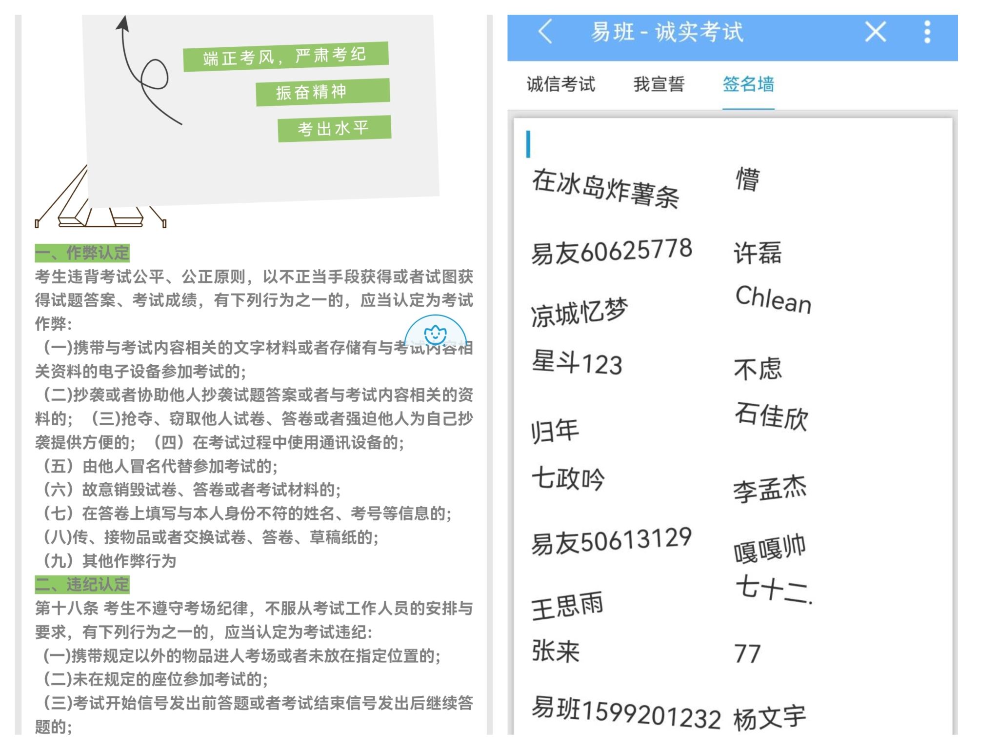 会上,各辅导员带领班级学生认真学习了《乐鱼平台_乐鱼(中国)一站式服务平台学生手册》中有关考风考纪的内容,对考试时应当遵守的注意事项及违纪行为的严重后果做了特别强调,向学生们传达了诚信考试的重要性和必要性,建议同学们对期末考试制定合理的复习计划,认真备考。各班辅导员还列举了校内外各种考试违纪行为被处分的真实案例,加强警示教育,要求同学们清晰认识到考试作弊的危害,希望他们严守考风考纪,认真备考,诚信考试,并组织班级同学签署诚信考试承诺书。