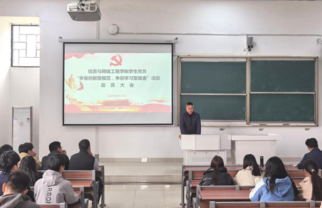 为贯彻落实习近平总书记在党史学习教育动员大会上的重要讲话精神,进一步加强学生党员教育,提高学生党员的创新素质和学习能力,发挥党员模范带头作用。3月31日下午,信息与网络工程学院于致知楼A111召开学生党员“争做创新型模范,争创学习型宿舍”(简称“双争”)活动动员大会。学院党委书记王振其、正处级组织员周向群、党委副书记韦乃学、各学生党支部书记及学生党员、入党积极分子参加此次动员大会,会议由王振其主持。