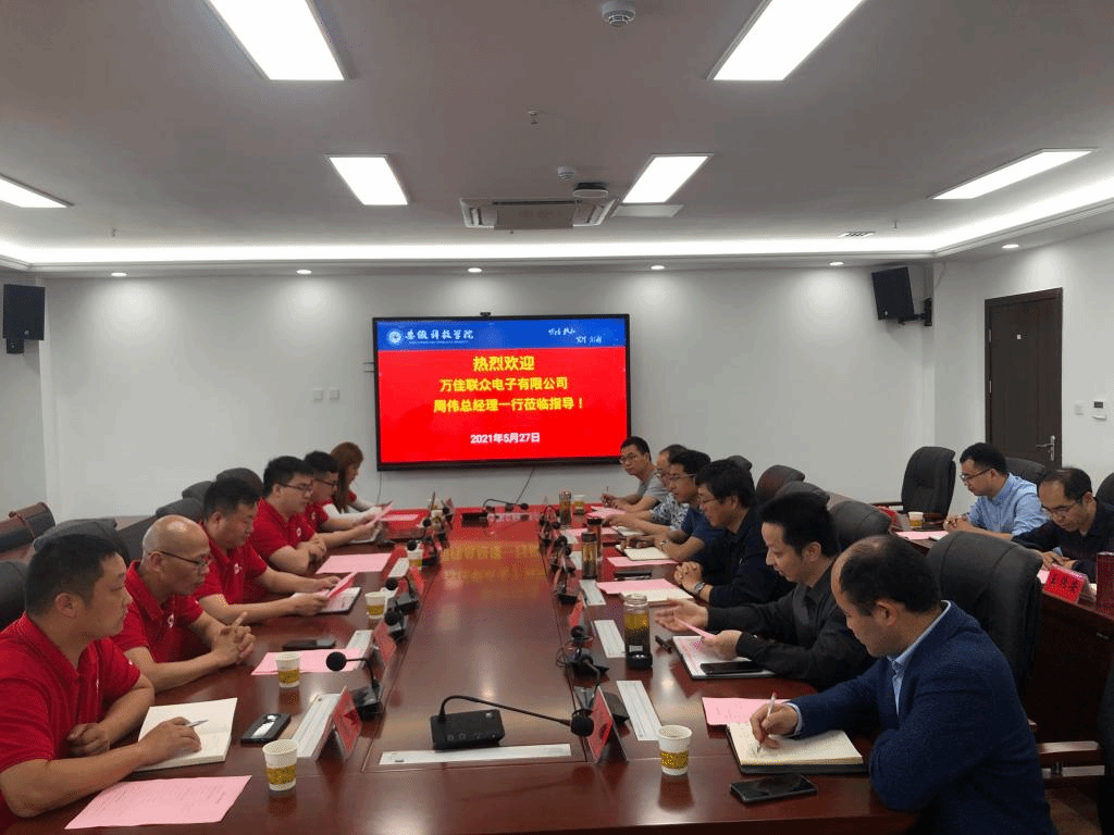 为进一步扩展校企协同育人格局,拓宽产教融合渠道,5月27日上午,万佳联众电子有限公司总经理周伟一行六人来校洽谈校企合作、科研攻关等事宜。校党委研究生工作部部长张春雨,信息与网络工程学院院长余宏杰,电子与电气工程学院副院长国海,机械工程学院副院长乔印虎,信息与网络工程学院副院长何恩节,信息与网络工程学院副院长曹浩以及各学院相关专业的系主任在西附楼416会议室接待了来访人员,会议由余宏杰主持。