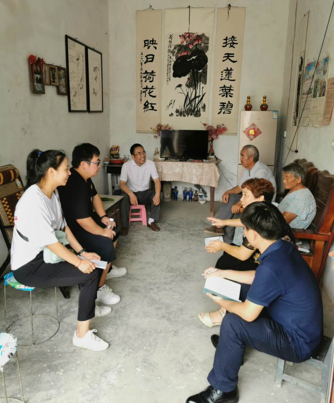 活动结束后,实践团还走进了贫困户家中。在已脱贫户肖大爷家中,团队成员们详细了解了肖大爷家的“吃、穿、住、”,家庭收入及基本医疗保障等的情况,仔细询问了对肖大爷家的扶贫工作落实情况,并对其当前家庭生活中存在的问题进行了交流。对于其中的一些问题,研究生们经过了思考和讨论,也向村干部们提出了自己的建议。此外,实践团还向贫苦户们传达解释了党的脱贫攻坚工作政策和乡村振兴战略等,贫困户们纷纷表示,他们都对县里和村里的扶贫工作感到满意,并决心鼓足干劲搞农业生产,也对未来的美好生活充满着希望和憧憬。