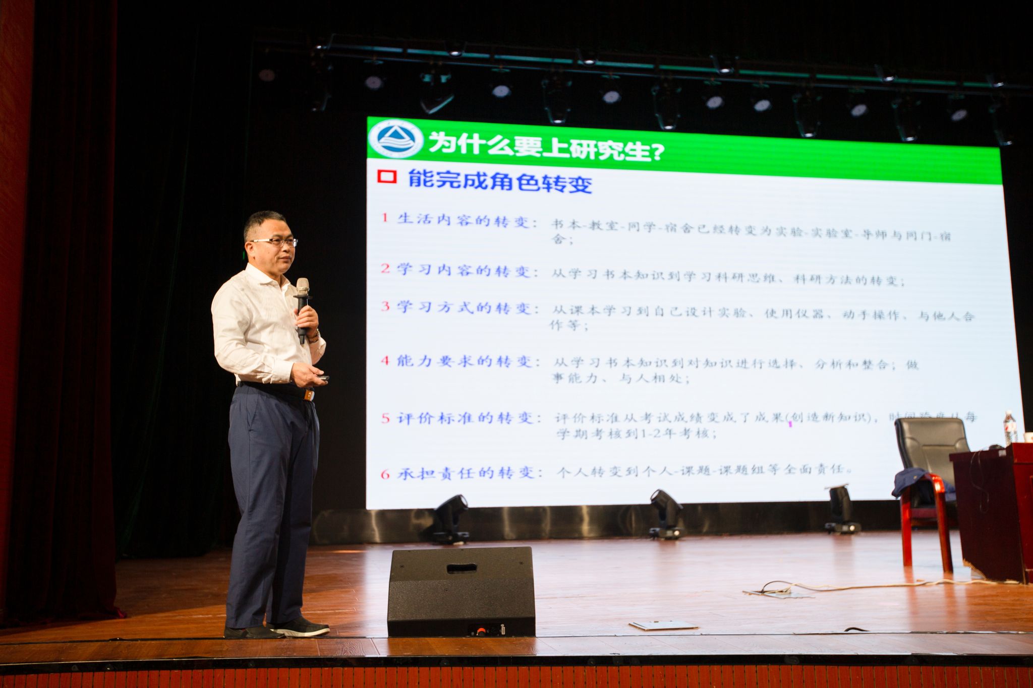 颁奖仪式结束后,刘立明以《研究生创新能力培养的实践与感悟》为题,结合二十余年科研育人经验,分享科研素养、课题设计与论文写作方法,鼓励研究生建立“可复制成功模式”,实现从被动到主动创新,为全校研究生搭建高水平交流平台。