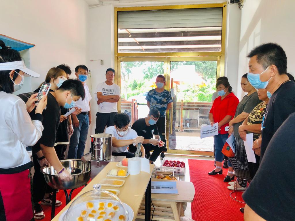 乡村振兴的关键在产业,刘家店镇的大桃产业面临着转型升级。为了振兴乡村经济,北京农学院在刘家店镇政府建立了教授工作站,帮助大桃产业提质增效。围绕着教授工作站,研究生们以创意农业为切入点,积极参与大桃的“供—产—销”三个环节,开展全方位的产业助力行动。一是丰富当地文创桃的设计图案,扩展了文创桃营销渠道。结合北京农学院一年一度的迎新工作,研究生们提出了“文创桃迎新生”的创意理念,设计并生产了一批北农特色的“文创桃”,在北京农学院迎新活动上发放给新生,在让新生充分感受校园温暖的同时,进一步拓展了文创桃的营销渠道,为未来文创桃的发展提供了参考。二是开展技术培训,提升文创桃成品率。研究生们是镇政府与教授工作站的纽带,为了推广文创桃,镇政府特地邀请驻站教授带领研究生为当地果农开展文创桃贴技术培训,研究生们身兼多职,从组织各村管果干部、农技推广员、果农,到布置会场、签到、拍照,再到试点示范、现场桃贴指导,最后到市场营销提供全程服务。通过研究生们的热情工作,果农们的桃贴张贴更加规范,成品率和工作效率日益提高。三是尝试开展大桃副产品加工,盘活二级桃价值。当地处理二级桃的主要方式是加工成桃罐头出售,产品附加值低。研究生们利用所学,实验开展桃酱、桃脯和桃酒制作,其桃酱产品达到了国家食品检验检测中心的质检标准。研究生们及时总结制作配方和流程,在镇政府和北京农学院教授的指导下向果农做培训示范,对桃酱等产品的制作进行推广。二级桃加工制作不仅减少了次级桃的浪费,还增加了农户经济收入,为未来大桃加工的产业化注入了新活力。