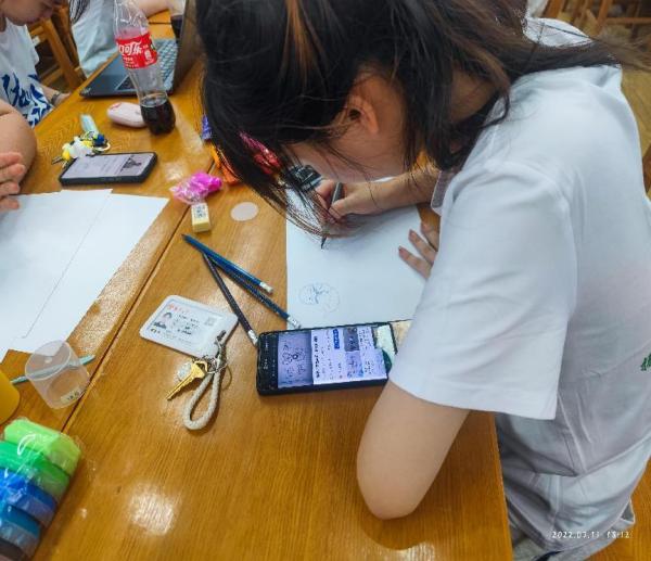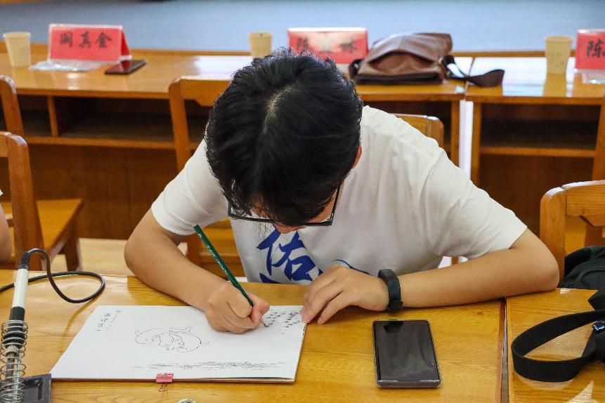 7月11日,年近8旬的非遗传承人阙真金带着自己的徒弟谢志安走进扬州大学生物科学与技术学院,采用播放视频、现场演示等多种形式进行烙画教学,他们也为江豚保护团队的志愿者们精心准备了“一家欢乐”、“拓沟为河”、“黑沙梦魇”、“绝路寻生”等十幅《天使贝贝之梦》系列原创江豚绘画。活动现场,志愿者们描摹拓印江豚图画作为底稿,用电烙笔在木板上烫出烙痕,细细勾勒江豚形象,通过不断转动木板使江豚线条更加流畅。同时,团队负责人号召志愿者们在烙画中加入个人元素,将烙画非遗与江豚形象深度融合。团队成团刘雪雅表示:“每一幅画都包含了很多江豚小细节,例如江豚产子图中,雄性江豚的眼是圆的,而雌性江豚的眼是半眯着的,它们不同的神态中富含的意蕴和情绪也不一样。这些都是我平时没有关注到的细节。我们以后也会在保护江豚的过程中求精求细,让江豚保护事业更上一个台阶。”