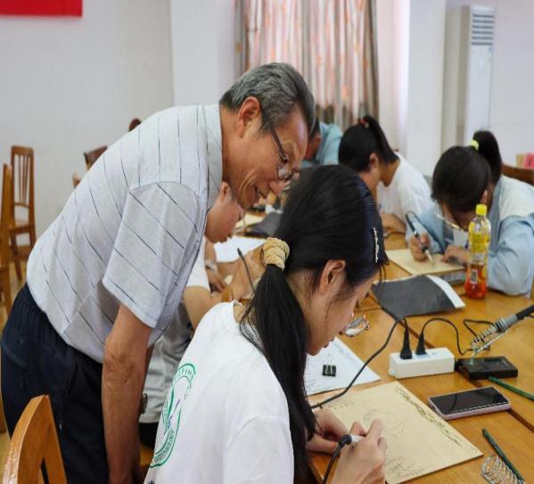 老手艺迎接新机遇,非遗融合江豚谱新篇。为推动非遗重新焕发魅力,助力当代青年增强文化自信,开拓江豚保护新思路,扩大江豚宣传的影响力。2022年7月11日,扬州大学生物科学与技术学院佑见江豚生态保护团队开展“学习烙画非遗,展示江豚之美”活动。团队中研究生与本科生成员积极组织活动过程,邀请到扬州市烙画非遗传承人阙真金、谢志安进行现场教学。结缘烙画四十余年的非遗传承人阙真金手把手地教导学生,引导学生学习非遗技艺,体验烙画之趣。