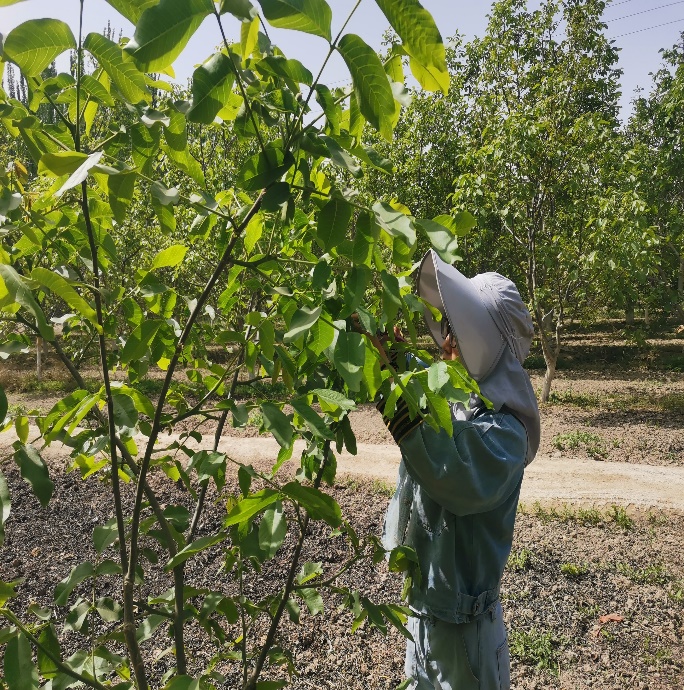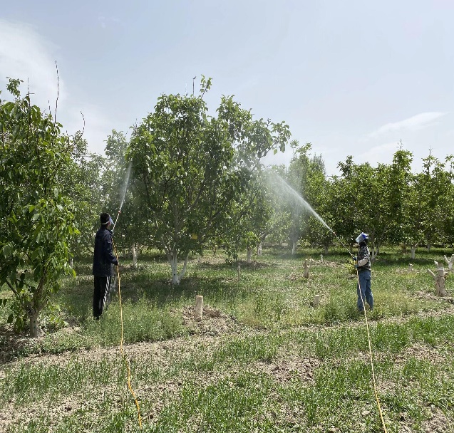 代热亚博依村是新疆阿克苏地区阿瓦提县曾经的贫困村,脱贫摘帽之后,部分脱贫户基本生活有了保障,但收入水平仍然不高。核桃为当地主栽林果树种之一,也是村民收入的主要来源,由于生产条件较差,管理手段落后,加之果农在核桃栽培管理中投入不足,普遍存在核桃产量低、品质差、病虫害严重发生等问题。为此,由学院副院长王世伟副教授、张翠芳副教授以及驻代热亚博依村工作队指导下,林学学科六名研究生组成了“六个核桃”乡村振兴志愿团队,前往代热亚博依村开启了一场与核桃相伴的“奇妙旅行”。