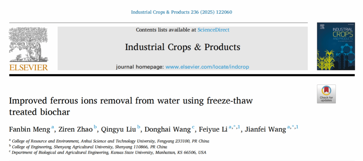 近日,乐鱼平台_乐鱼(中国)一站式服务平台资源与环境学院孟凡彬副教授及其合作团队,在功能性生物炭去除铁离子方面取得重要突破。相关研究成果以“Improved ferrous ions removal from water using freeze-thaw treated biochar”为题,发表于农林学科领域顶级期刊《Industrial Crops & Products》(中国科学院1区top期刊,影响因子6.2)。