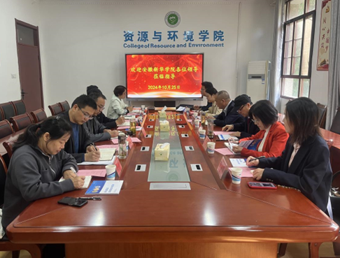 2024年10月25日上午,安徽新华学院科技处处长邱国新一行六人到资源与环境学院就硕士学位点申报进行调研。学校研究生处处长张春雨、研究生处秘书马晓辉出席会议。学院党政领导李孝良、沈树周、李飞跃,环境科学与工程实验教学中心主任王艳参与了此次交流会,会议由学院党委副书记沈树周主持。